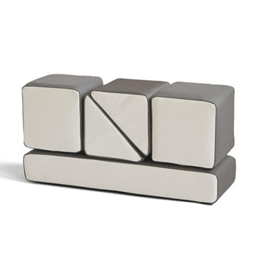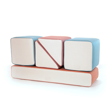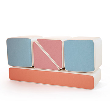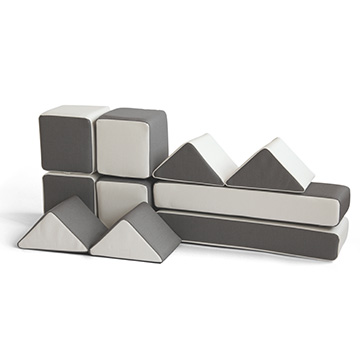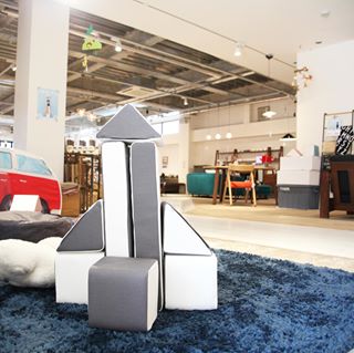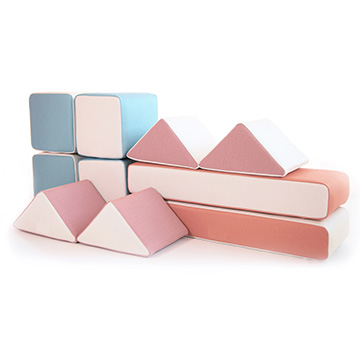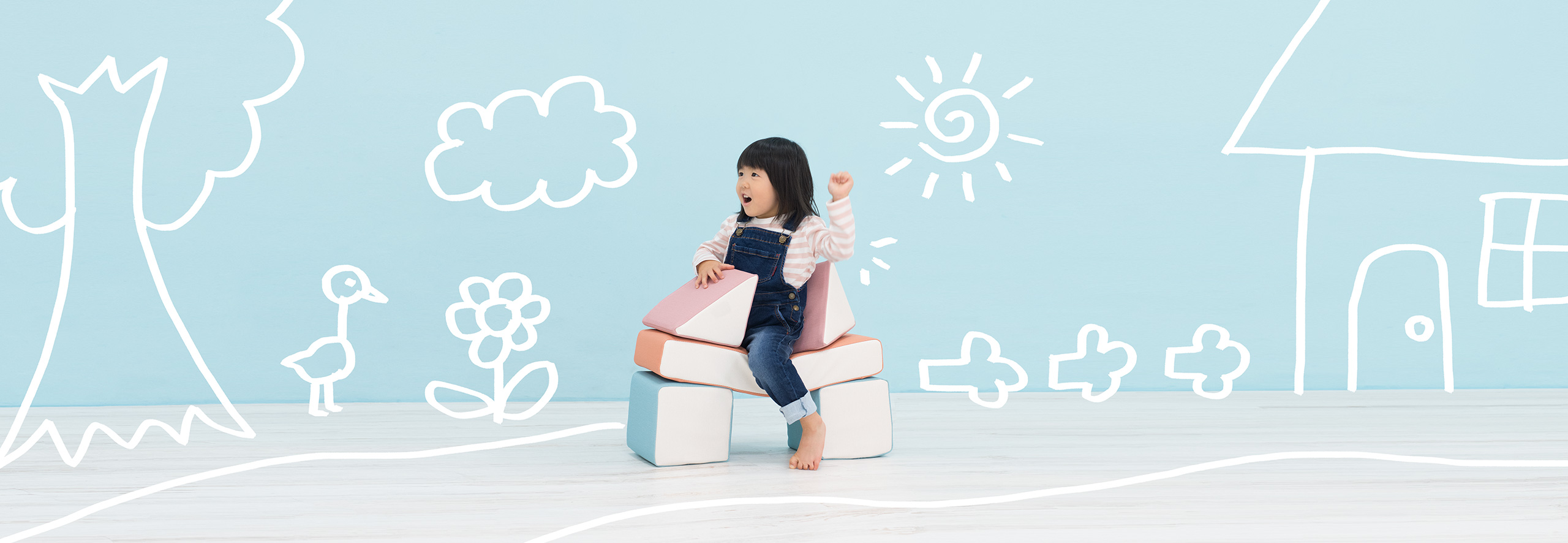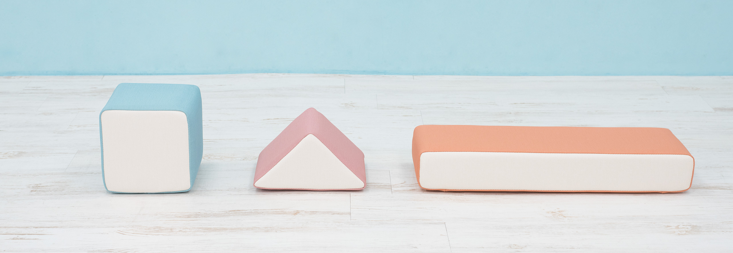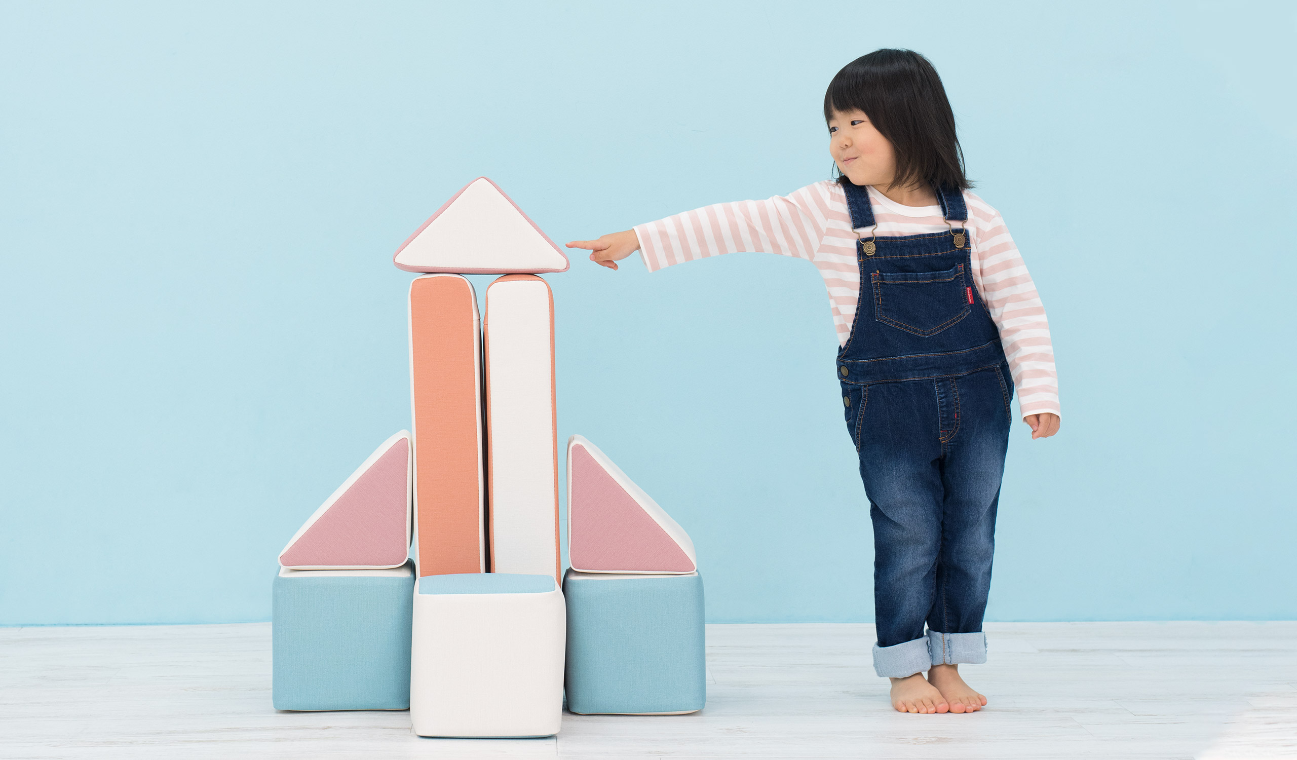 「iebito」のPLAYクッションなら、家の中でも体をめいっぱい使って遊べます。高密度ウレタンだから、押しても踏んでも、すぐに元通り。真四角と三角形と長方形。3つのカタチが子どもの想像力をかきたて、創造力を養います。